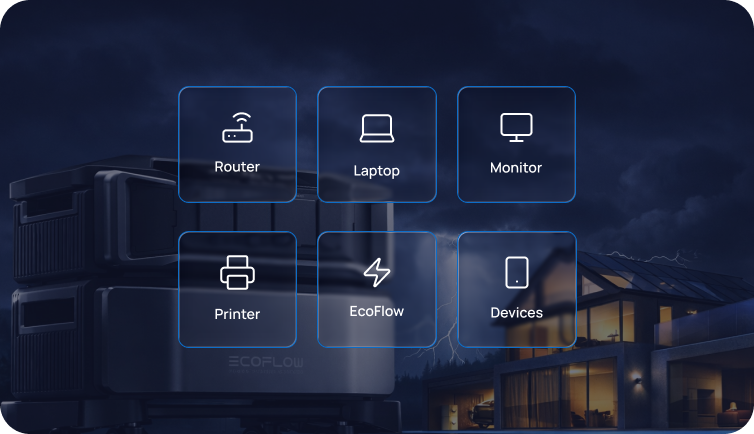 Los sistemas de respaldo de batería EcoFlow para el hogar mantienen encendidos tu router, laptop y equipos de trabajo para que tu productividad continúe durante interrupciones eléctricas.